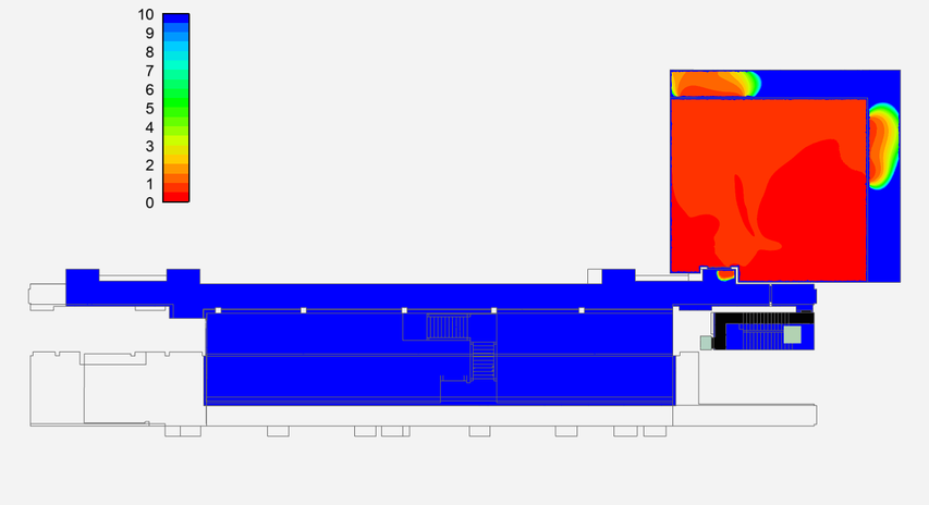 Through modelling a room directly of from the atrium space, a fire simulation was undertaken whereby the occupant evaluate from the room into the atrium and exit according to evaluate the smoke ventilation system located in the space. The atrium space was modelled to a high level of detail using Ansys Fluent CFD package.